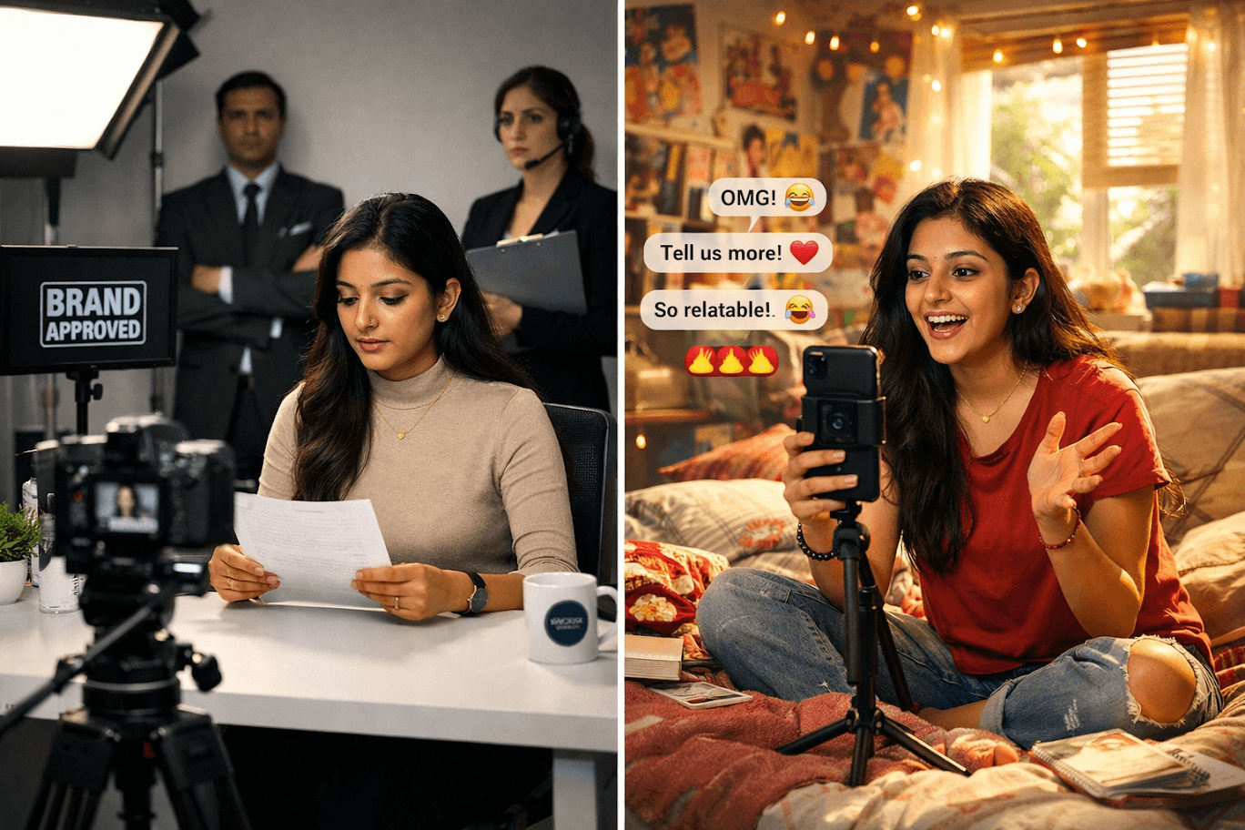 The barking dog in the background? Keep it. The slight stumble in Hindi? Keep it. The unmade bed in shot? Keep it. Creator content generates 11 times more impressions and 14 times higher engagement than brand-owned content [3] and the primary reason is that it looks nothing like an ad. The mess is the message.