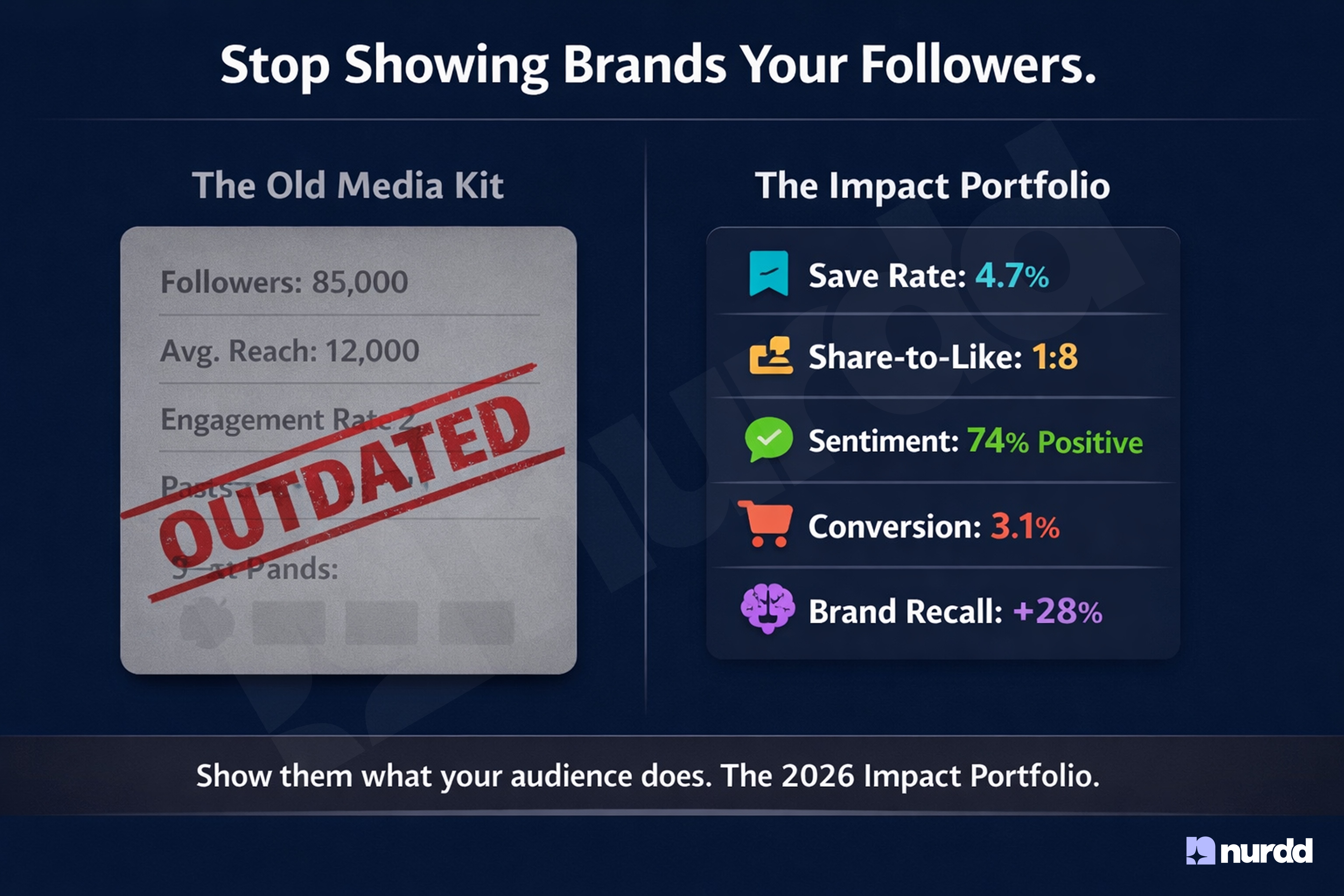In 2026, the creators winning the best brand partnerships are not the ones with the most followers. They are the ones who can walk into a meeting and demonstrate with data that their audience takes action. The Impact Portfolio replaces screenshots of likes with metrics that prove behavioural change: save rates, share velocity, AI-analysed sentiment, and direct conversion data. Think of it as the influencer media kit rebuilt for a performance-first industry, the same document your brand contact will read, but filled with metrics that prove outcomes instead of listing audience sizes.