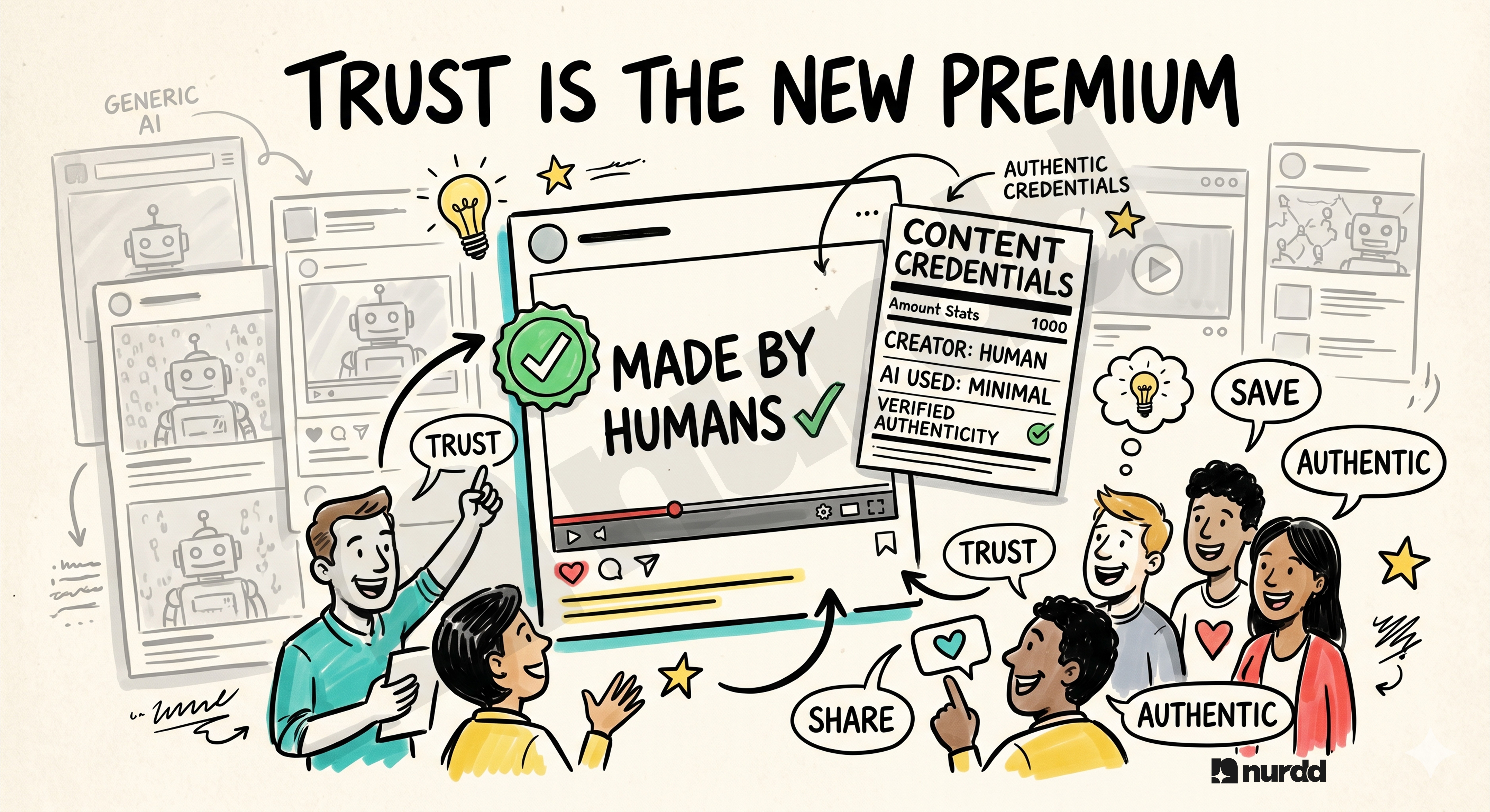 Premium pricing is emerging for human-made content. Industry analysts are predicting that brands will be able to charge a premium for verified human content the way organic certifications transformed food sales. Adweek's trend forecast suggests CTV and YouTube may boost premiums by up to 50% for human-verified video. Luxury houses like Louis Vuitton are already trialing artisan-only campaign credentials.