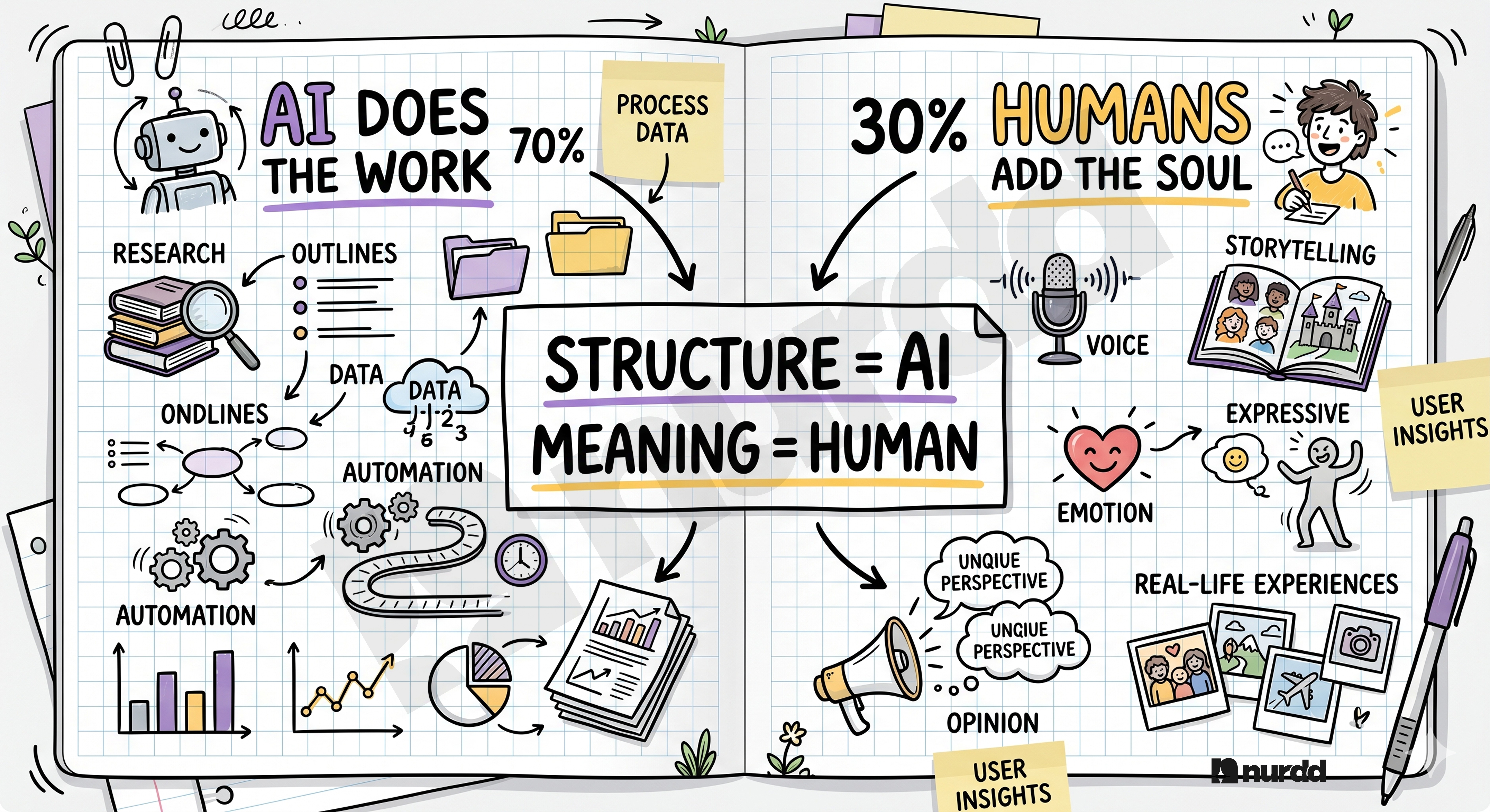 30% of the process is reserved exclusively for humans โ and it's the 30% that matters. Final voice. Emotional truth. Specific anecdotes. Polarizing opinions. The phrasing of the punchline. The decision of which insight to lead with. The texture of how something is said, not just what is said.