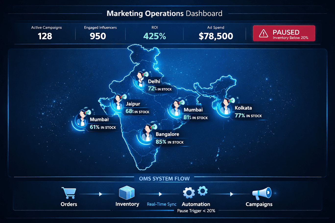 Integrate your Order Management System, Unicommerce or Increff both consolidate Blinkit, Zepto, and Instamart into a single dashboard with your marketing workflow. Set one hard rule: if dark store stock in a live campaign city drops below 20%, the paid boost on that creator's content pauses automatically.