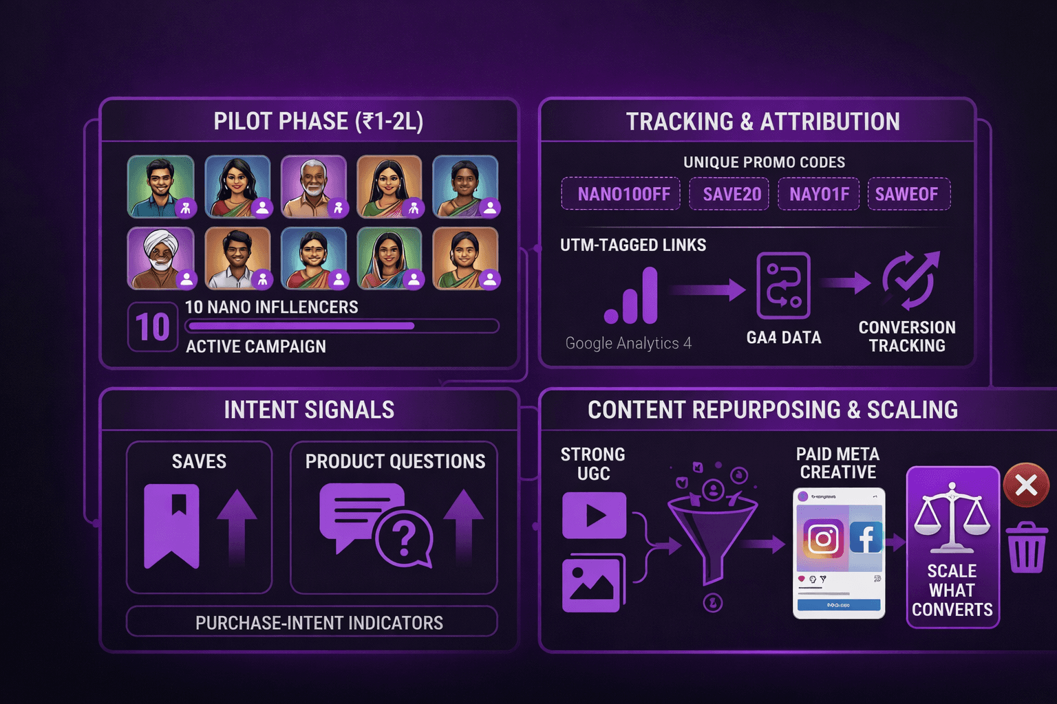 Step 1: Run a ₹1–2L pilot with 10 nano influencers first.