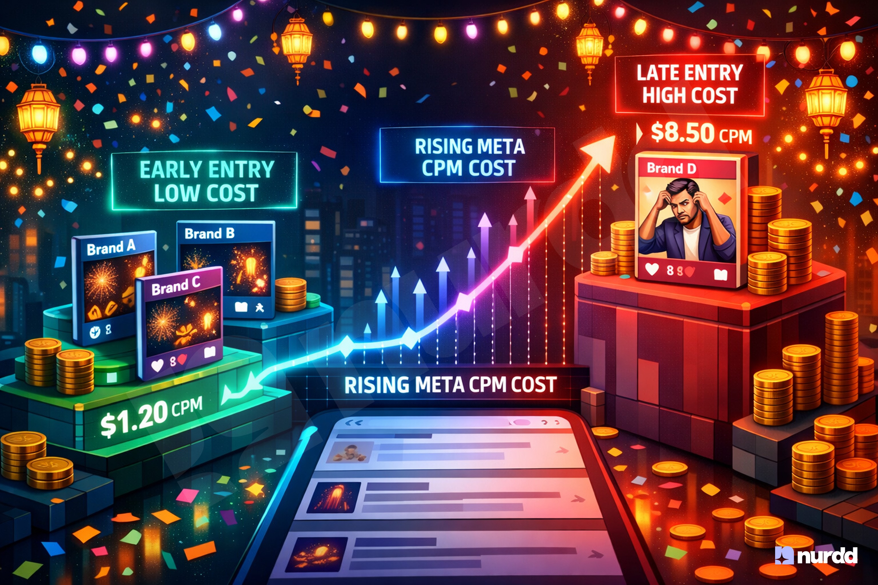 In India, the festive season Navratri through Diwali is the single most competitive advertising window of the year. Short-form video formats like Reels and YouTube Shorts command 20–25% higher fees than static posts during the festive rush. And Meta CPMs rise anywhere from 20% to 80% or more during this period as brands flood the platform with budgets. The brands paying the highest price aren't just victims of competition they're victims of timing. They arrived at the party after the DJ had already left.
