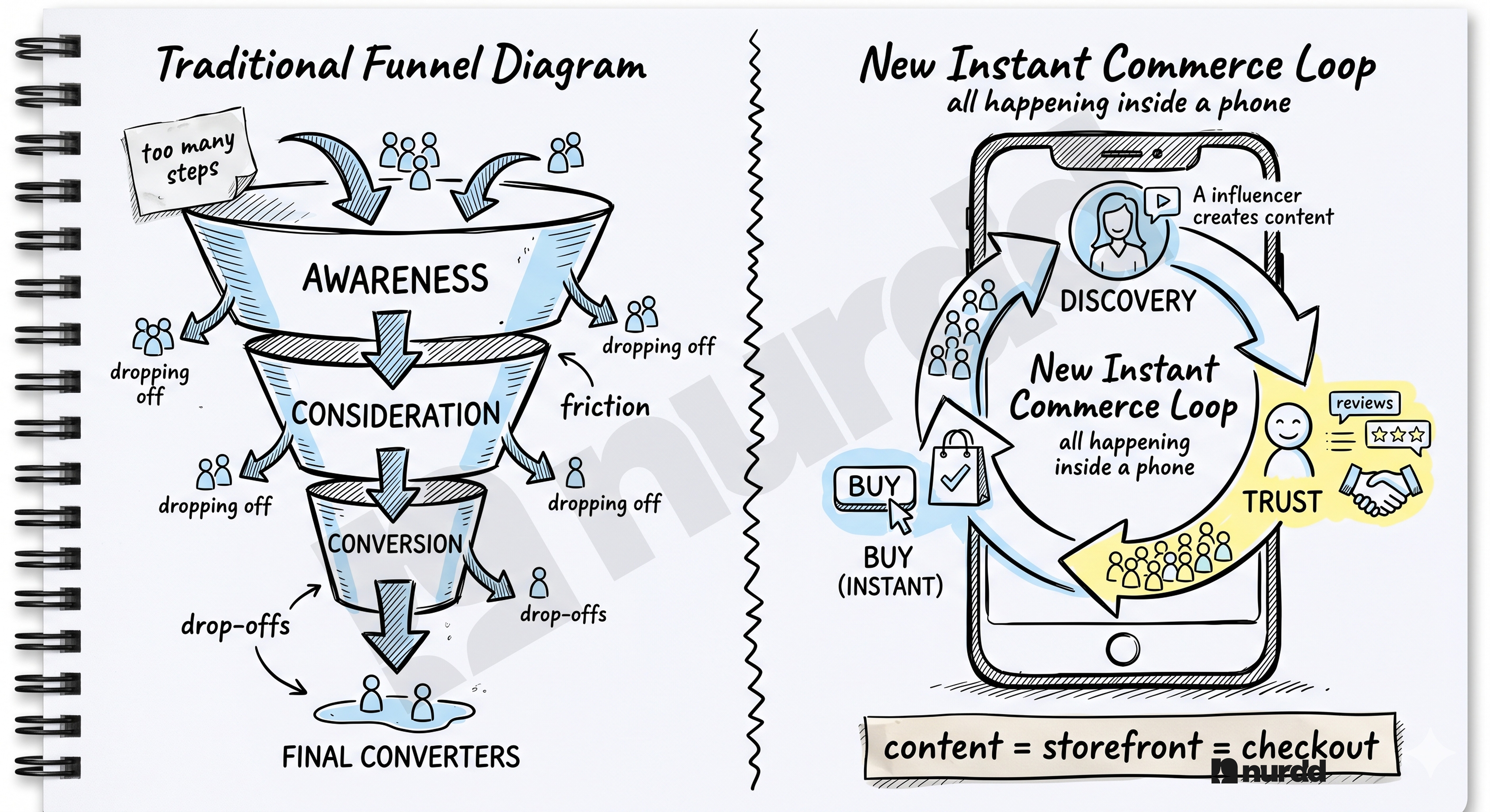 The new model is what industry observers are calling "Discovery-to-Checkout" - a single, continuous moment in which the user sees a product, trusts the creator recommending it, taps a button, and pays. No page transitions. No mental load of switching apps. No "let me search for this later." The friction that the traditional funnel was built to manage has been engineered out of the experience entirely.